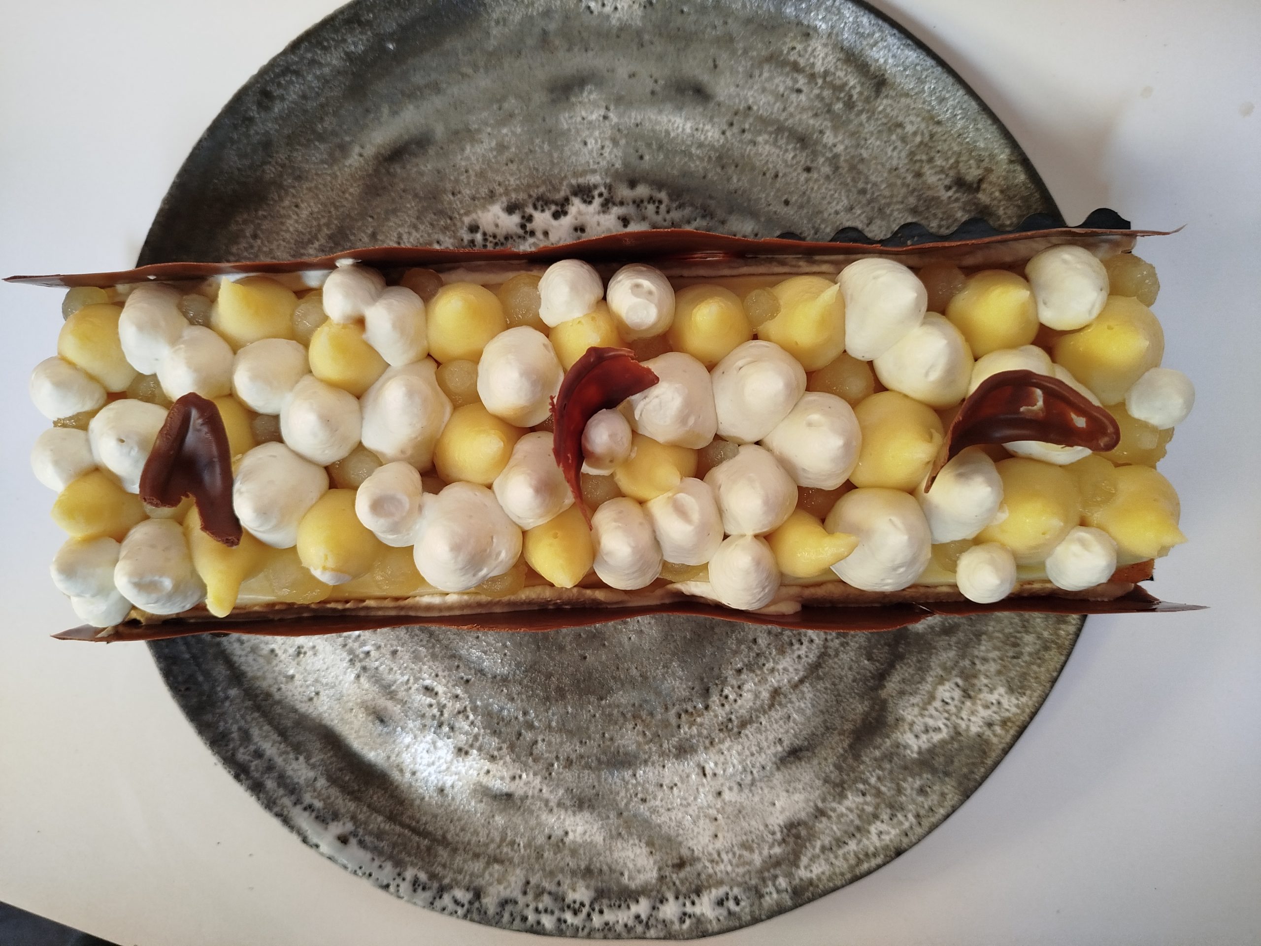 Biscuits thé matcha / croustillant thé matcha / marmelade citron clémentine / crème légère citron clémentine / crème vanille thé matcha